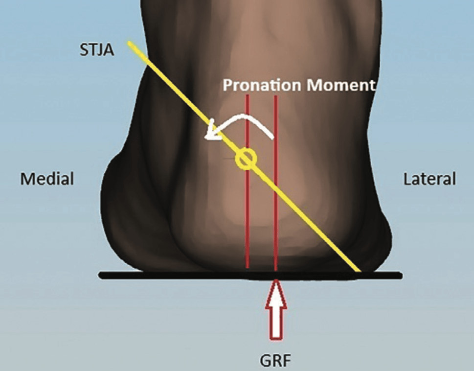 The STJA is typically oriented from posterolateral plantar to anteromedial dorsal, though the degree of angulation varies considerably between individuals. The location of this axis in the transverse plane is crucial in determining the moment arm of GRF acting on the rearfoot. A pronation moment occurs when the GRF passes lateral to the STJA (Figure 2), while a supination moment occurs when it passes medial to it.