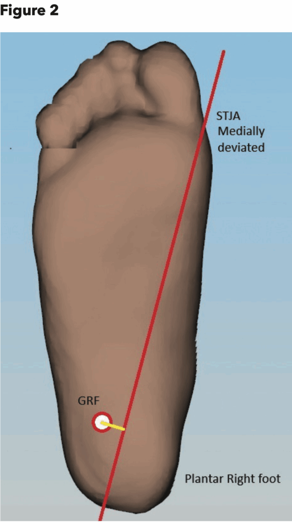When the GRF passes lateral to the STJA it creates a pronatory torque on the subtalar joint (Figure 1). Excessive or prolonged pronation moments contribute to conditions including adult acquired flatfoot and medial knee stress. Effective orthotic and pedorthic interventions aim to shift the GRF vector medially, thereby reducing the pronatory torque and supporting more efficient load distribution through the foot and lower limb.