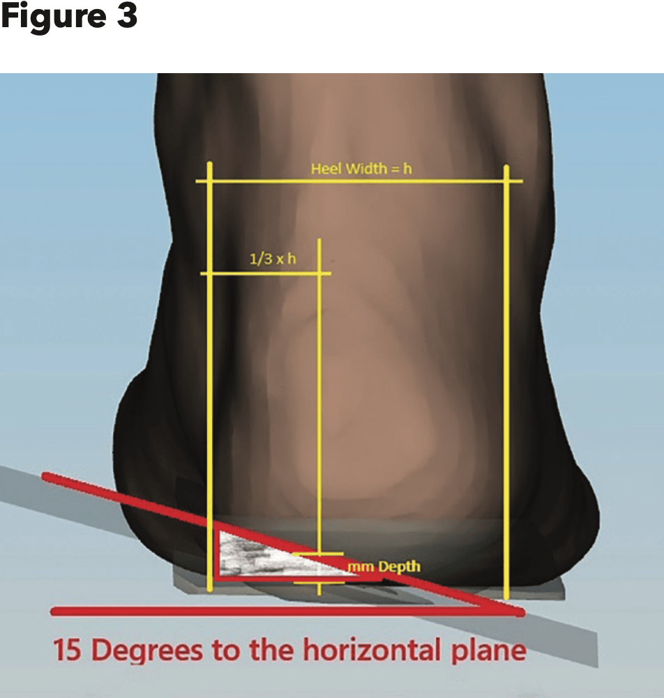 The depth of the skive is an important variable. The reference point is set at one third of the width of the heel from the medial side. At that location, a 15-degree wedge of heel plaster is removed to the desired depth (Figure 3):