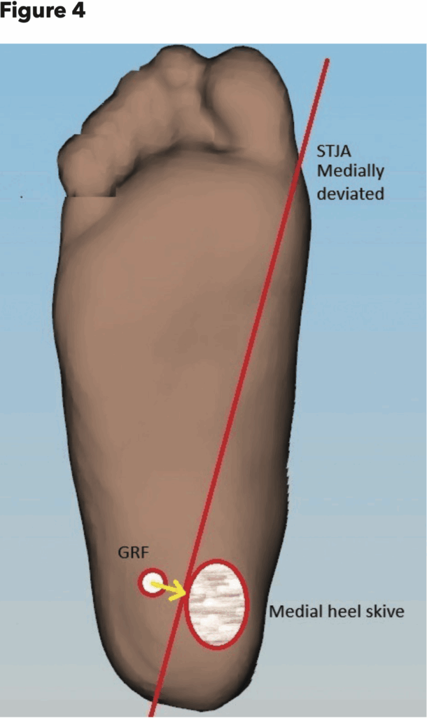 The primary mechanical effect of a medial heel skive is the redistribution of GRF beneath the calcaneus. By selectively elevating the medial portion of the heel cup, the skive increases the local plantar pressure under the medial calcaneal tubercle. This shifts the resultant GRF vector medially, decreasing the pronatory torque on the STJA (Figure 4). As a result, the net moment about the STJA is reduced, leading to improved rearfoot alignment and motion control during midstance. It is especially helpful in feet with a medially deviated STJA; in these cases, there is a greatly reduced medial moment arm for the posterior tibial tendon to do its work of resisting pronation.
