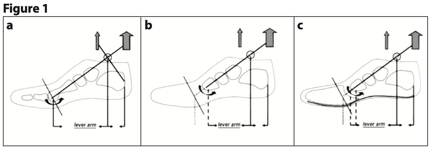 A full foot plate dynamic carbon AFO will restore the lever arm to counteract the plantarflexion moment from the posterior muscle group. Ideally, a carbon-fiber foot plate that is more stable at the midfoot with the dynamics tapering (thinning) down toward the toe will direct the forces toward the shoe break. Some of that force can be transferred via a strut to the anterior tibia and can then be reflected back during the propulsive gait phase. The AFO will also act as a transferable sole stiffener.
