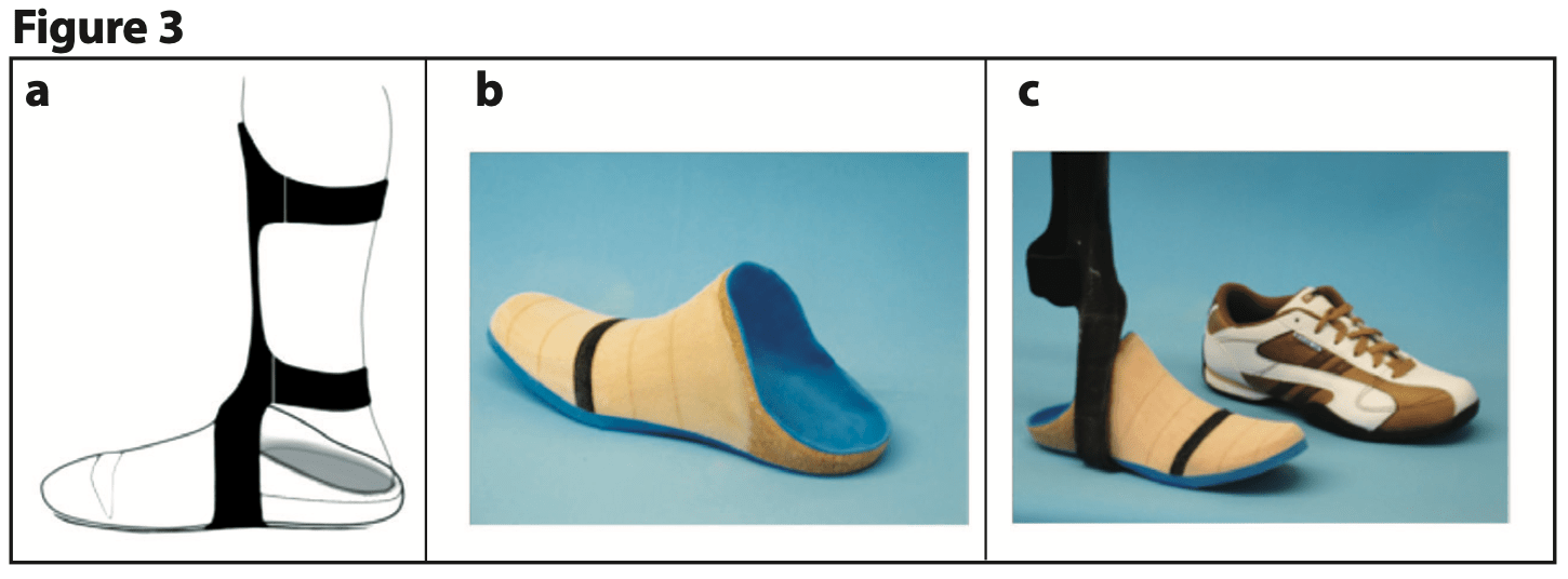 As a working hypothesis, we propose a socket-type orthotic with anterior wedging, lifts, and posting on a full foot plate dynamic carbon AFO. The socket-type orthotic will disperse pressure; anterior wedging dorsiflexes the foot, thereby realigning the calcaneal angle; lifts and posting address any LLD; when used with a full foot plate dynamic carbon AFO, this will provide the necessary combination for limb preservation and gait restoration (Figure 3).