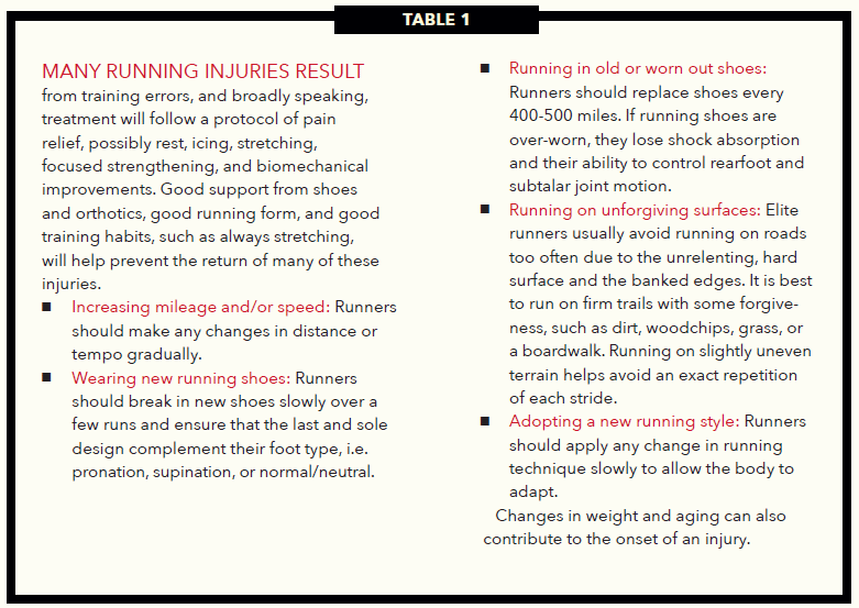 When experienced runners develop a chronic injury, it is necessary to investigate possible changes to their regimen. Stephen Pribut, DPM, a member of the Runner’s World advisory board, cautions against the “terrible toos.”1,2 These are common mistakes linked to over-training: too much, too soon, too fast, too often, and with too little rest. In light of this, training considerations become important when evaluating and treating a patient (Table 1).