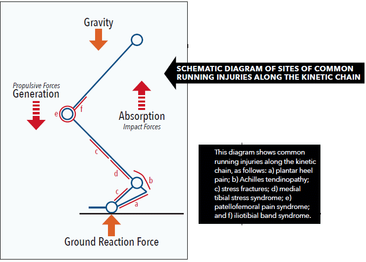 Originally it was believed that most running injuries were the result of high-impact forces, particularly those generated at heel strike. But slowly the thinking has changed as it has become clearer that many injuries occur due to the forces being dissipated and generated throughout the entire stance period. During the energy absorption phase, from initial contact to mid-stance, the transfer is from distal to proximal, up the kinetic chain. Movements across the subtalar joint, ankle, and knee, and the related muscle and tendon stretching, allow for energy transfer and the eccentric loading of muscles. The impact of initial contact is not just at the heel: the effect is borne along the entire leg and occurs over a longer period. This sequence is then reversed in the second half of stance when muscles concentrically contract, providing propulsion.